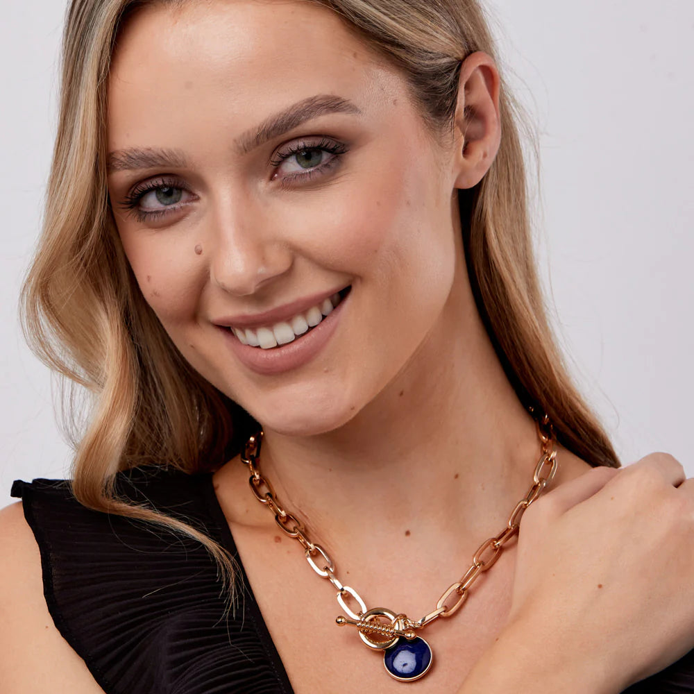 Chunky chain necklace with front ring & toggle fastening & royal blue natural stone drop. Length 45cm.