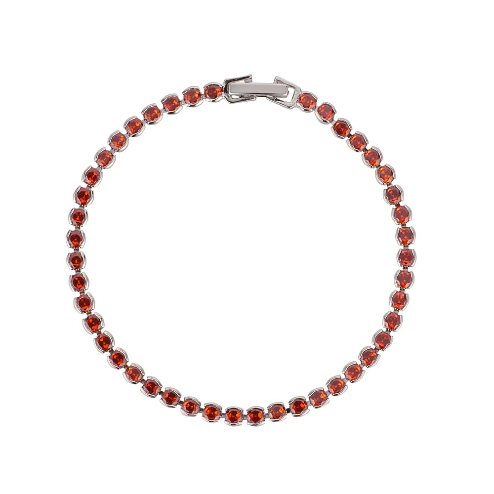 Miniature rhodium plated tennis bracelet with Garnet CZ stones. Elegant when worn alone and also ideal for layering with watch or other bracelets. Fold over clip fastening.