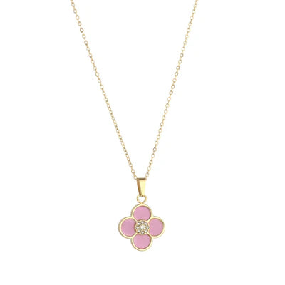 Beautiful pink enamel pendant with clear CZ centre piece. Length 42 + 5cm extension. Gold plating.