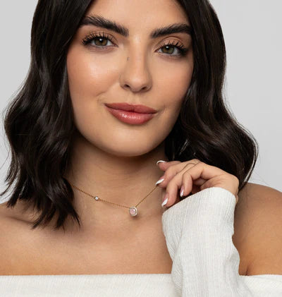 Miniature rose water opal stone embellished with tiny CZ stones.  18K gold plating.  Length 16" + 2" extension.
