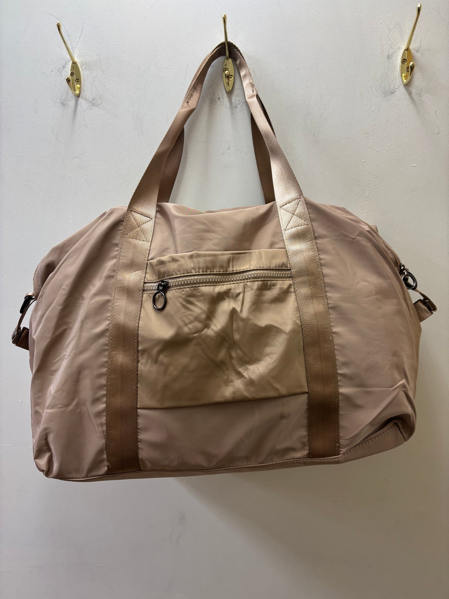 This Gym bag is the perfect addition to the life of any busy woman. Ideal for the gym, weekend or overnight trips or even as a handbag, this bag has everything you need. There are multiple pockets of the exterior and pouches on each side. It has a contrast interior with even more pockets on the inside. It can be handheld but also includes a shoulder strap. There is a decorative keyring included. This is the perfect bag for modern life