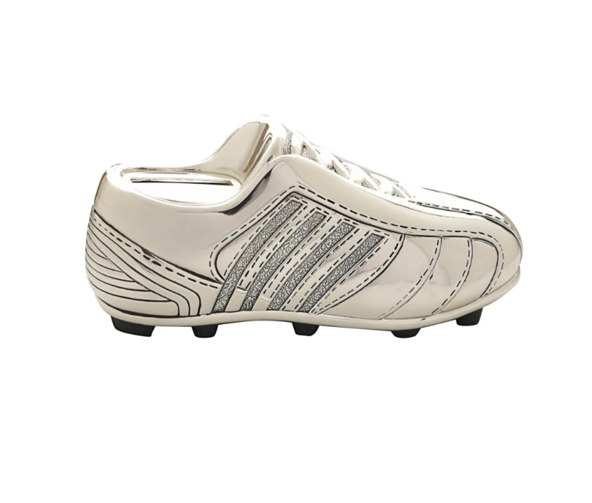 This wonderful keepsake provides glistening decoration for the nursery of new family arrivals which will be cherished eternally. The real silver plated money box offers great attention to detail which perfectly captures the charm of the ‘beautiful game’. It features a combination of textured and smooth finishes, complete with large money slot for saving coins and easy-to-remove rubber bung on the base.