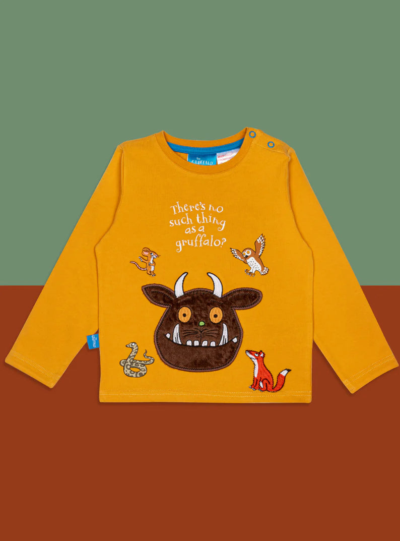 This mustard top features a fluffy friendly Gruffalo face with his woodland friends print on the front.