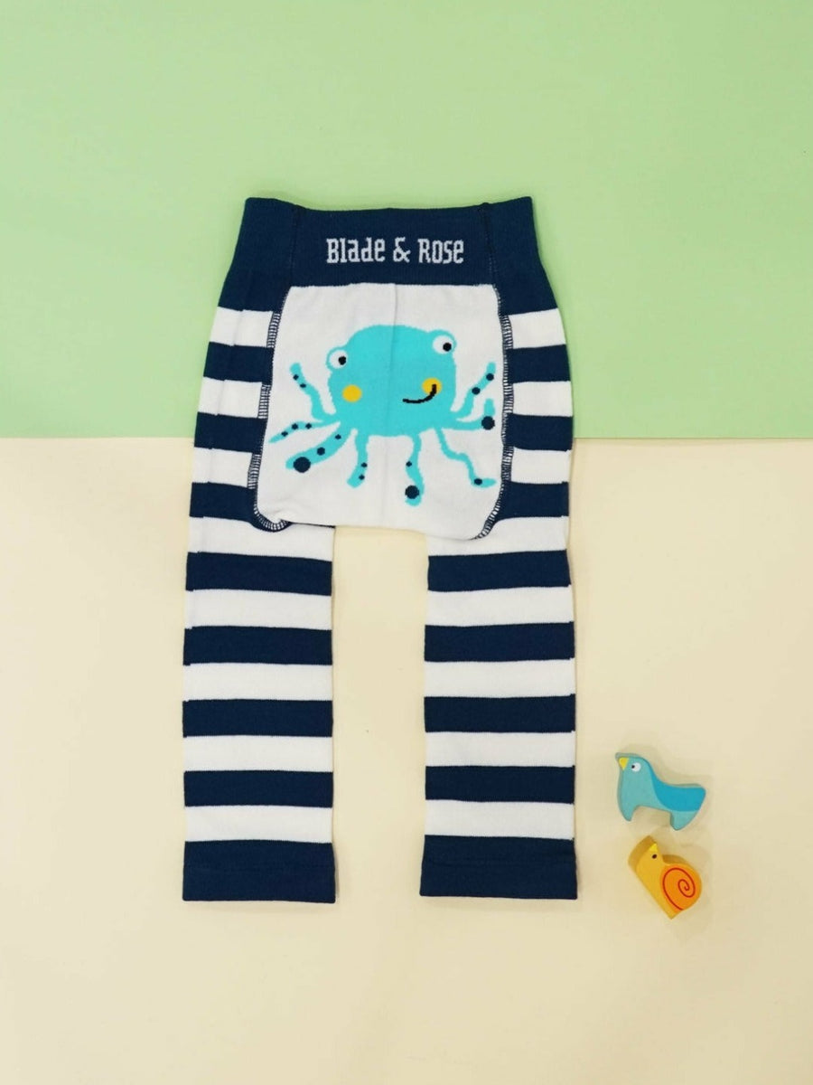 Bold, dusty-blue and cream striped leggings with quirky Octopus on the bum.