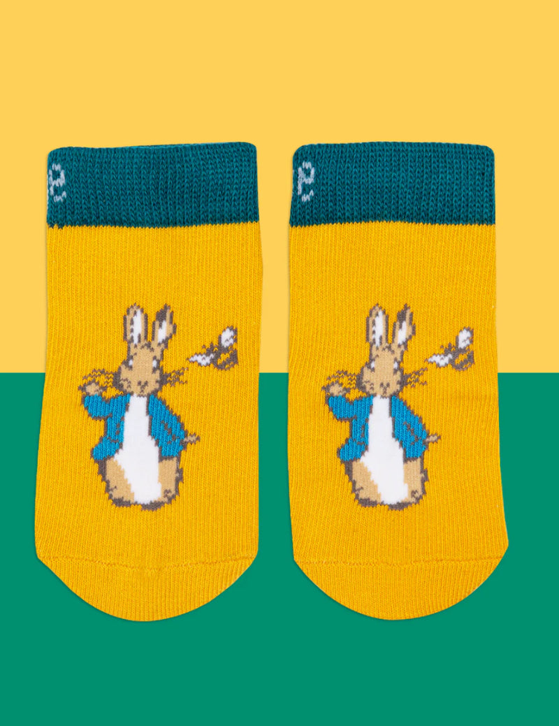 Introducing the delightful Peter Rabbit Woodland socks for children! These socks feature a beautiful yellow color with a charming Peter Rabbit print on the front, adding a touch of fun and personality to any outfit.