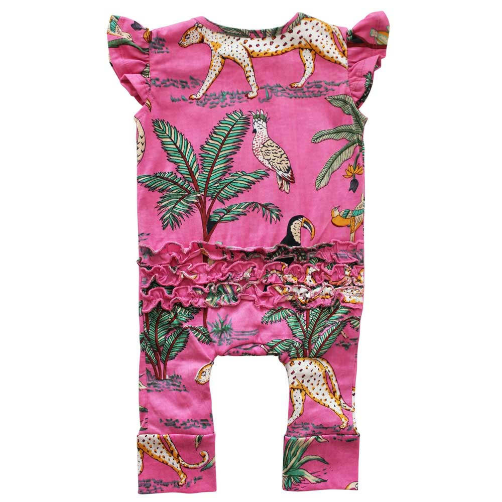 This bold pink short-sleeved stylish suit with its on-trend jungle print is great for little ones on the go. The footless jumpsuit has beautiful ruffle-capped sleeves and cute frilly trims running across the bottom. Our safari print has a busy scene of leopards, monkeys, and exotic birds with lush green jungle trees against a mauve-pink background.