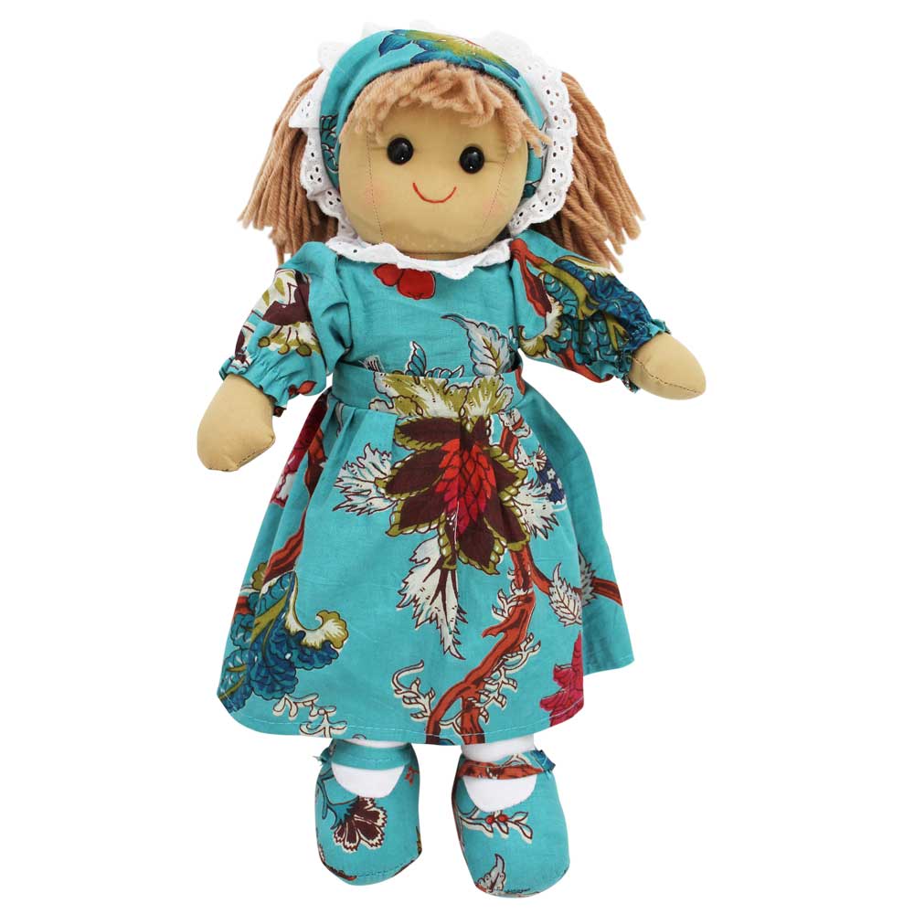 This cute rag doll is comfortingly soft and sure to become a favourite toy. This dolly wears a removable cotton long-sleeved dress with an exotic flower print on a teal background and lace trim around the neckline. She wears a matching lace-trimmed headband on her light brown hair worn in bunches and has matching floral shoes. Our rag dolls are designed to be loved by all ages.