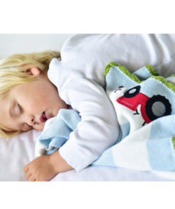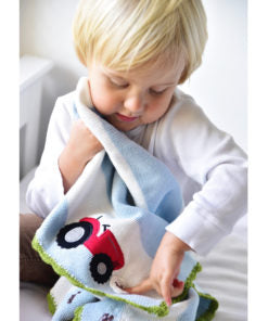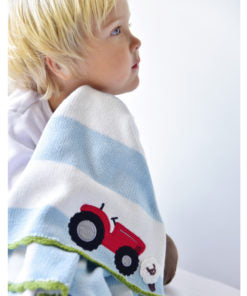 Our tractor-themed blanket is knitted in wide sky blue and white stripes with a grass green scalloped edge. It features a cute embroidered and appliqued sheep motif in each corner, a bright red tractor and a couple of fluffy clouds to complete the countryside scene.