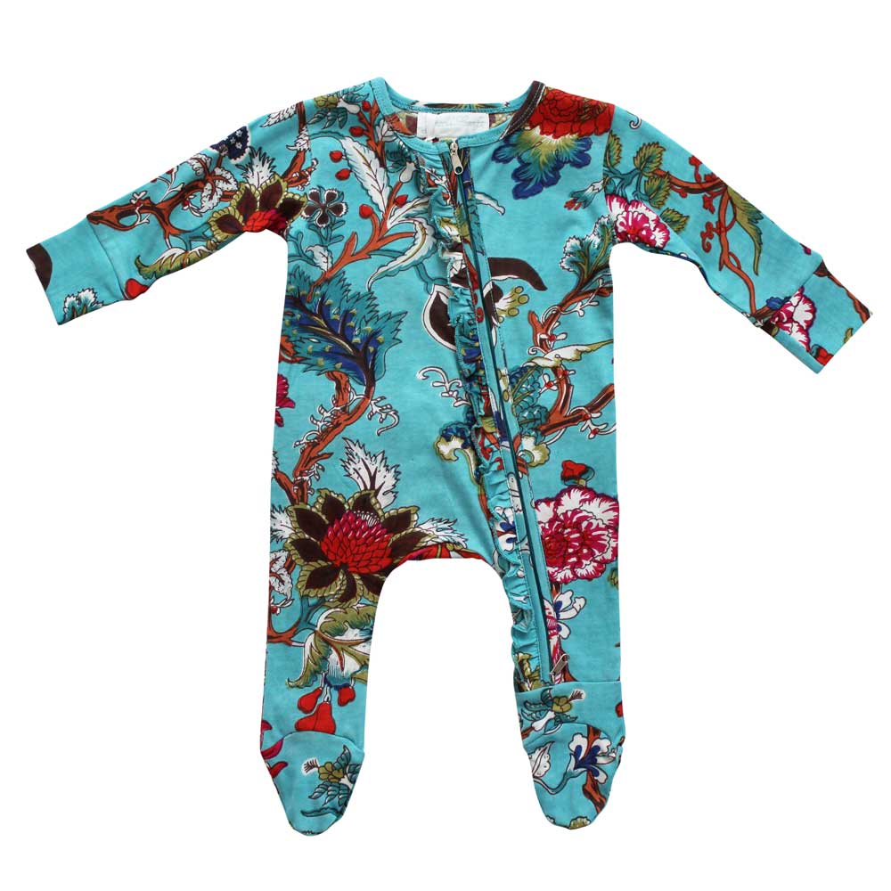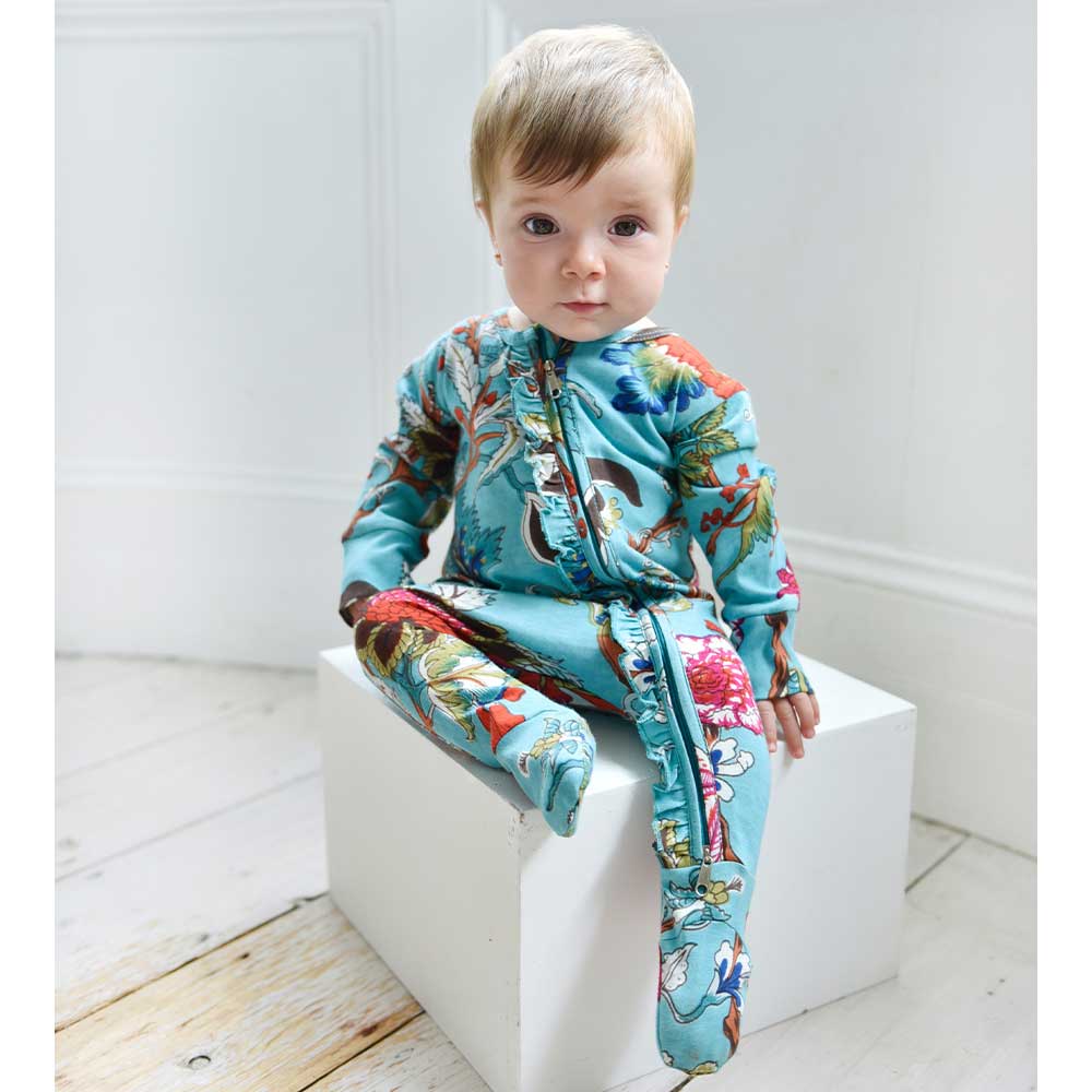 This vivid teal jumpsuit with multi-coloured exotic flowers will make bedtime colourful and stylish! The jumpsuit has enclosed feet and a ruffle-trimmed diagonal zip running from ankle to neckline, great for speedy nappy changes. The back of the jumpsuit has cute frilly trims running across the bottom.