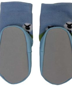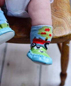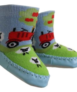 These colourful farm-themed moccasins depict a scene with a tree laden with apples, a field full of sheep and a jolly red tractor against a pale blue sock with matching pale blue soles.