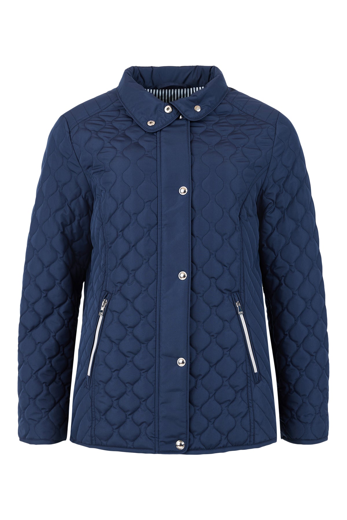 Stay warm and stylish with our 843-Navy Quilted Jacket by Frandsen. The navy quilted fabric with silver trim detailing not only adds a touch of elegance, but also provides warmth and comfort. Perfect for any cold weather occasion.