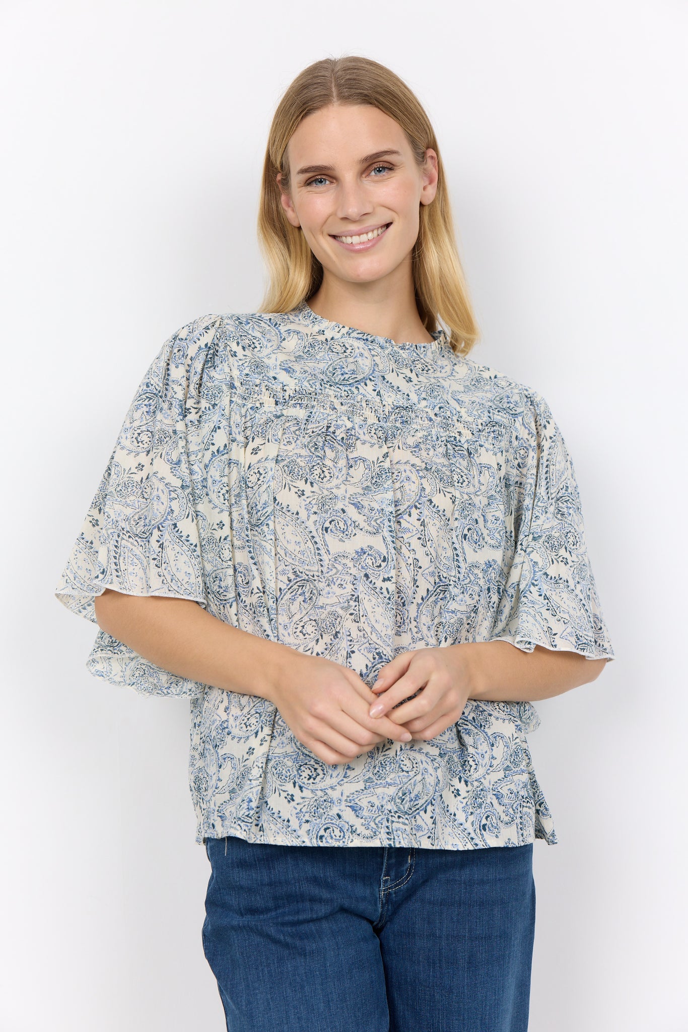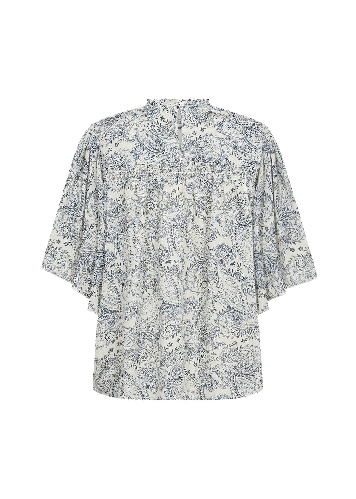 This blouse with a traditional paisly print is tailored from 100% Organic cotton. It features a ruffled collar, elasticated detali at the bust, elegant loose half sleeves, and a relaxed fit, ensuring comfort and breathability. This top can be paired with tailored trousers or a flowing skirt for a timeless look suitable for varied occasions.