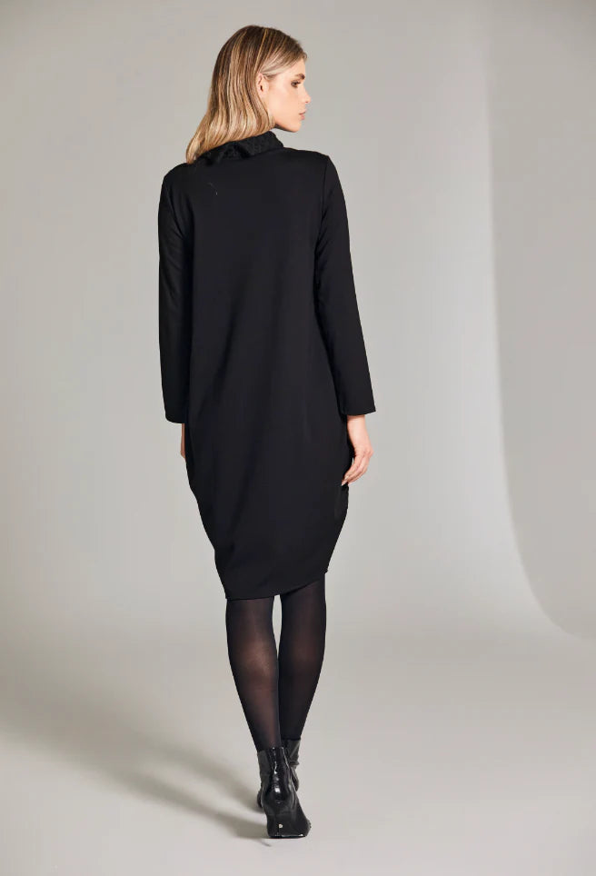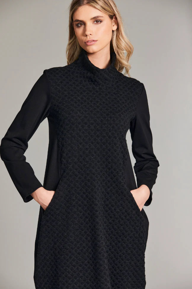 W24200- High Neck Raised Jacquard Panel Dress- Black- Peruzzi