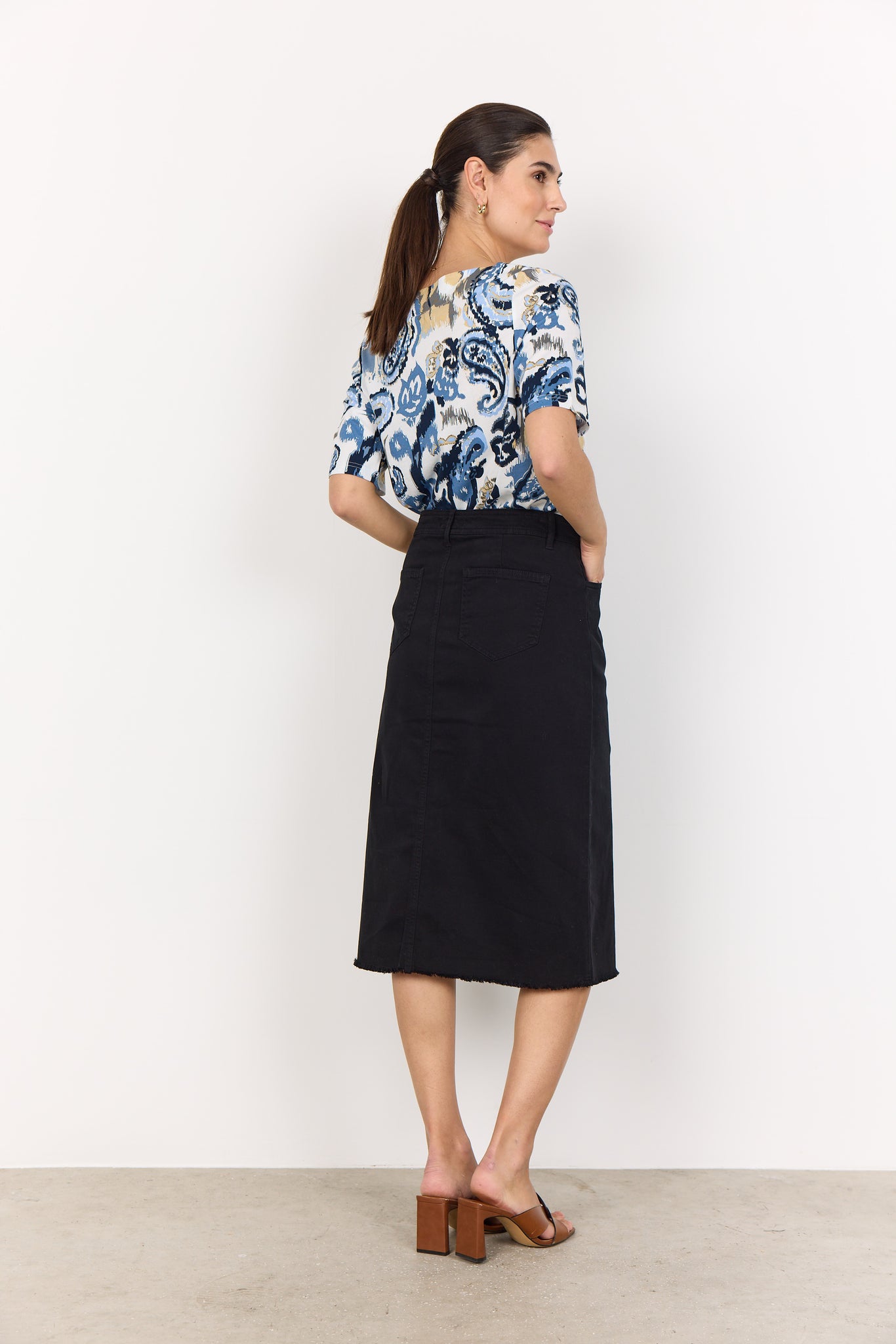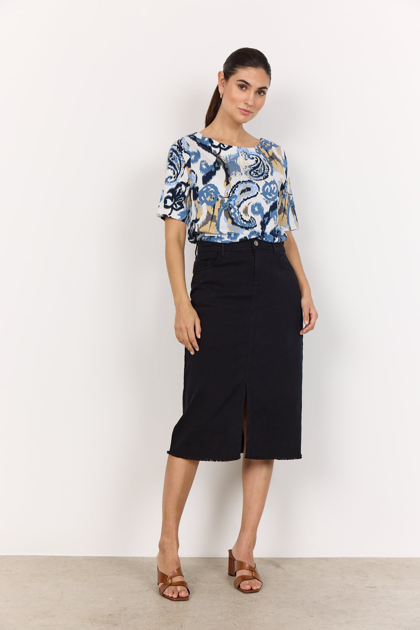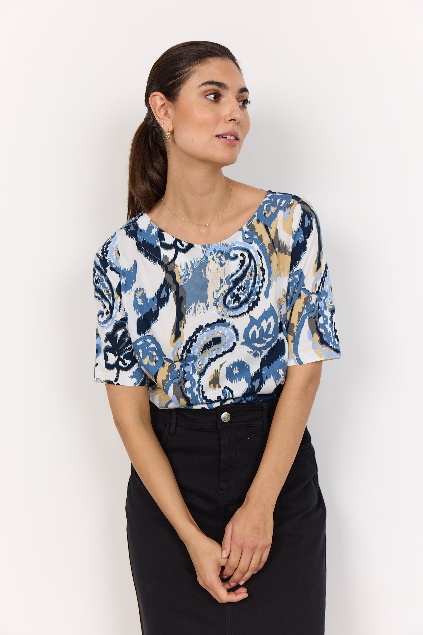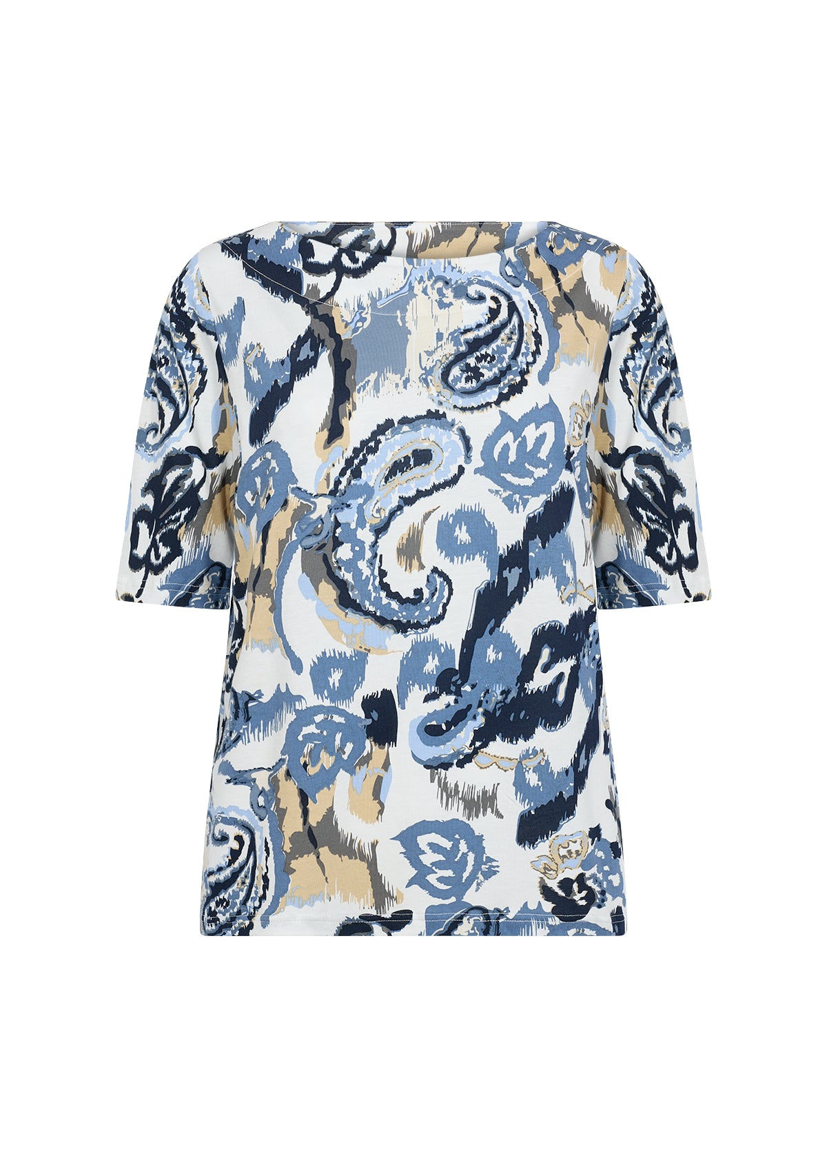 SC-FELICITY AOP 501 is a soft T-shirt made from a blend material consisting of 50% Organic cotton, 50% Viscose. This T-shirt has a boat neckline, short sleeves and has an abstract paisly print. It can be paired with tailored trousers or casual denim for a comfortable look.