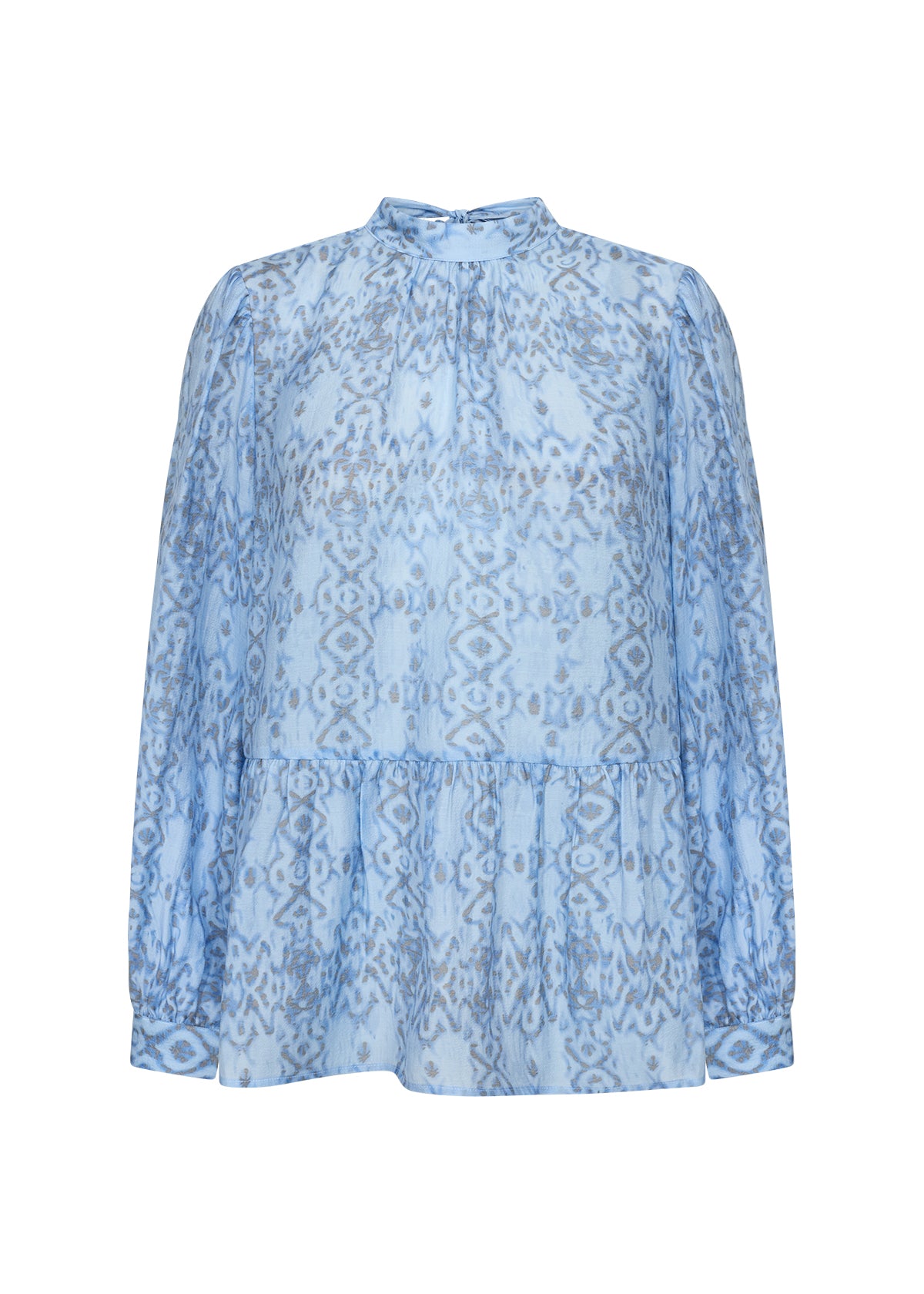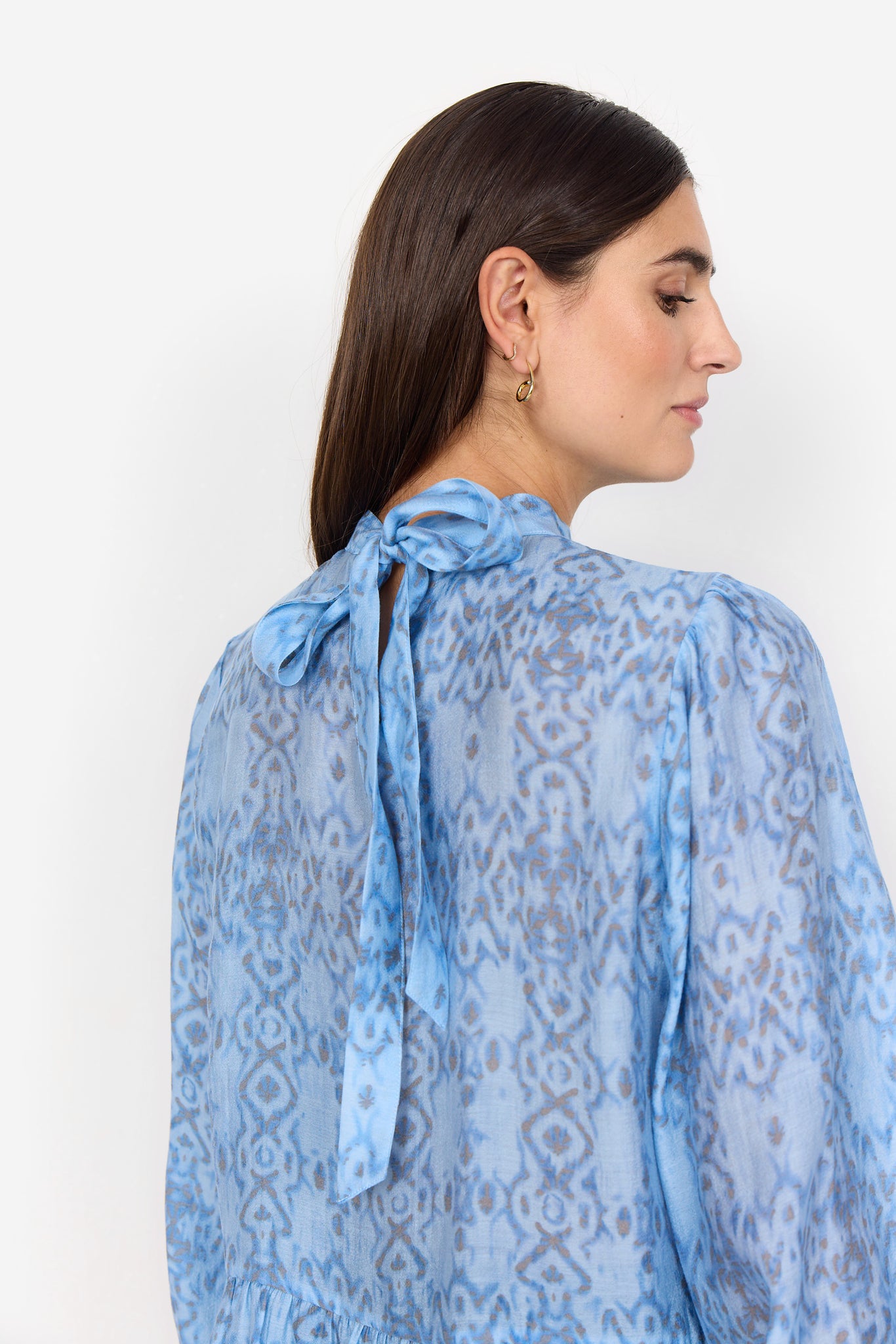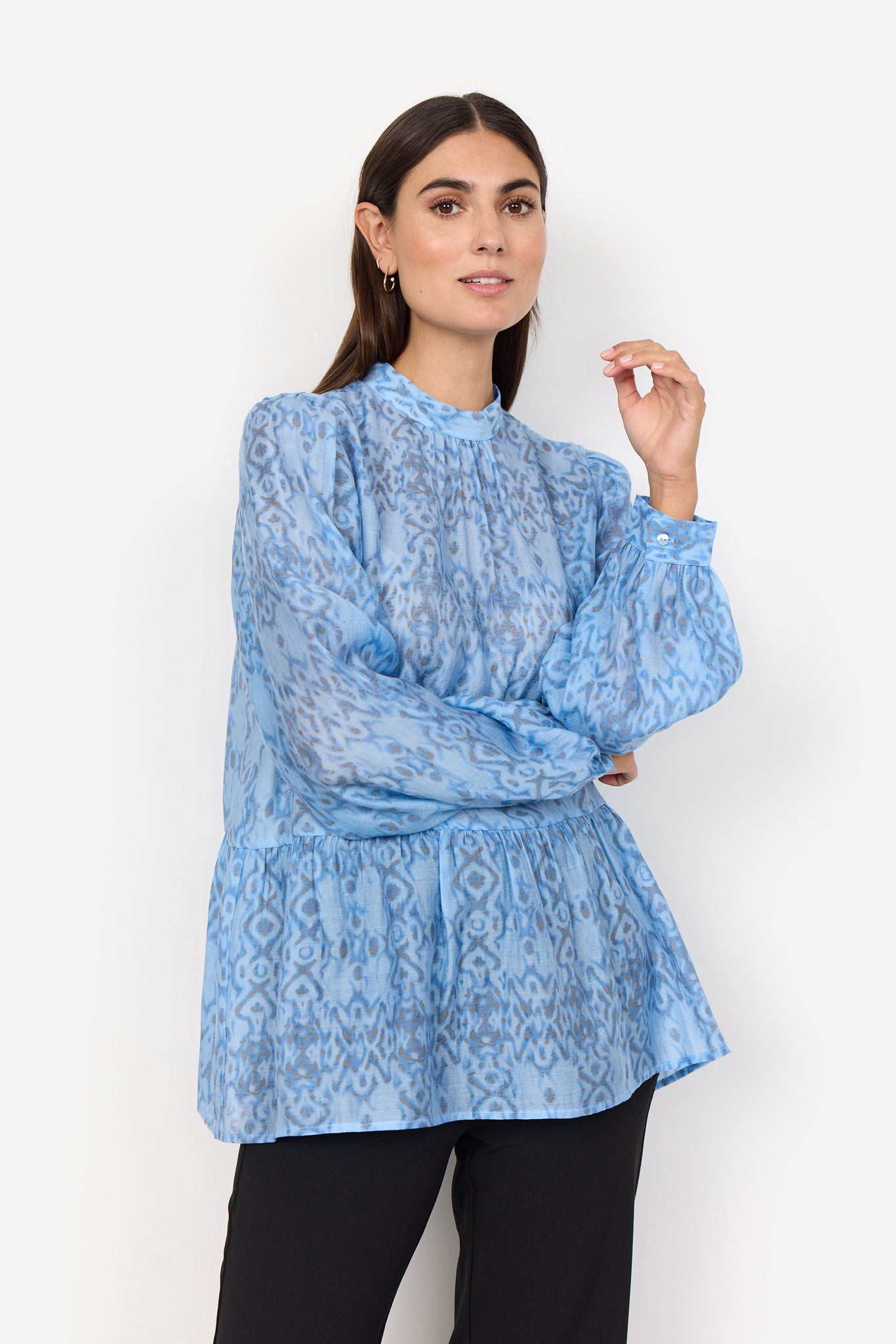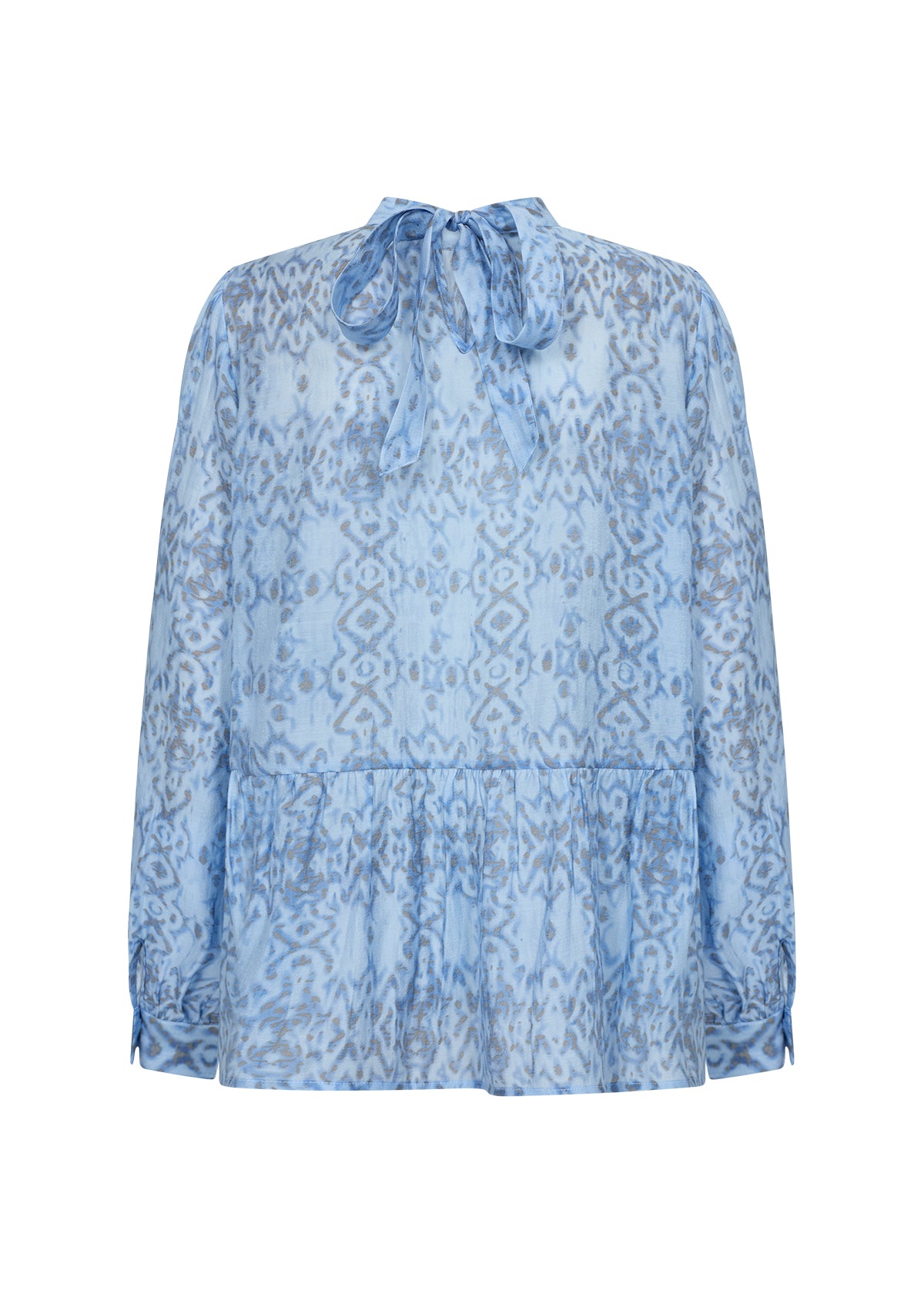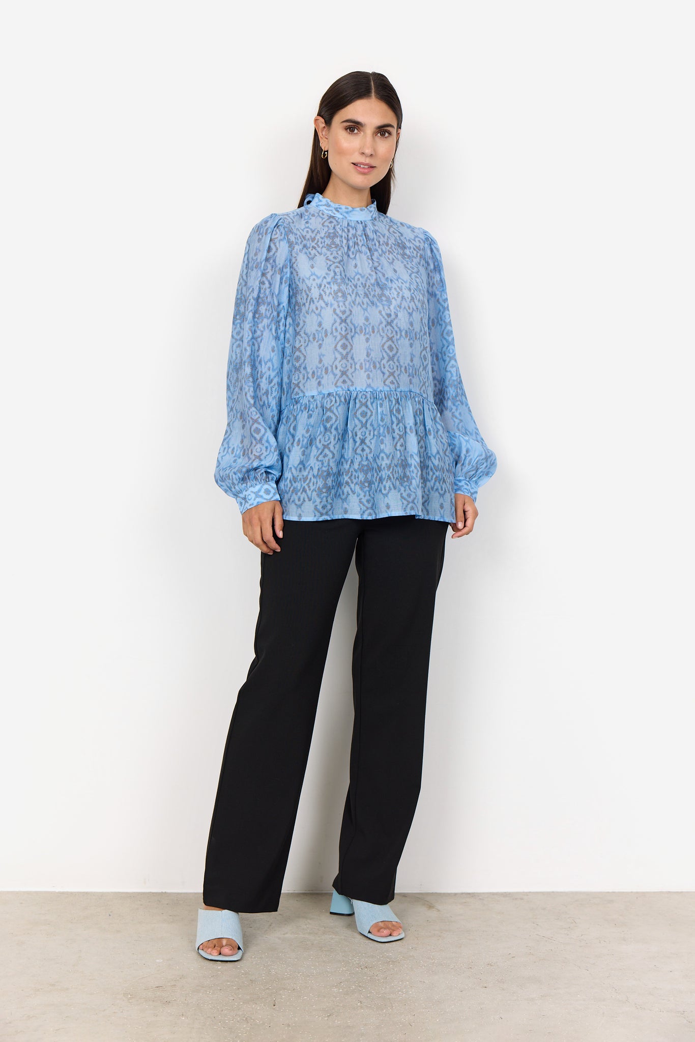 SC-OSWIN 2 is a stylish blouse made with 70% ECOVERO Viscose and 30% Polyester. It features a high collar, a tie at the neck, and long sleeves with gathered wrists, complemented by a lay at the waist creating a beautiful drape. This blouse can be paired with tailored trousers or a skirt for a refined daytime or office look.