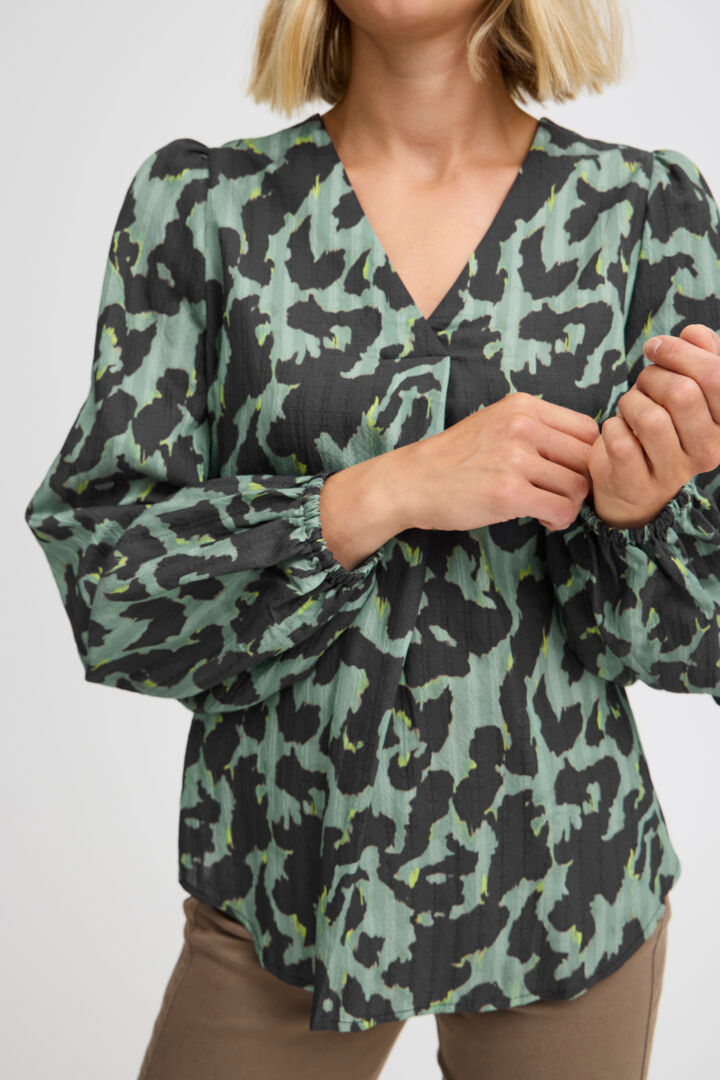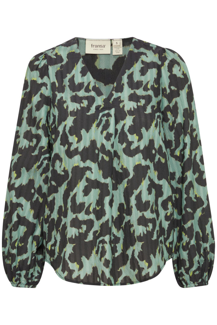 4115- Long Sleeve V Neck Blouse- Green Mix- Fransa