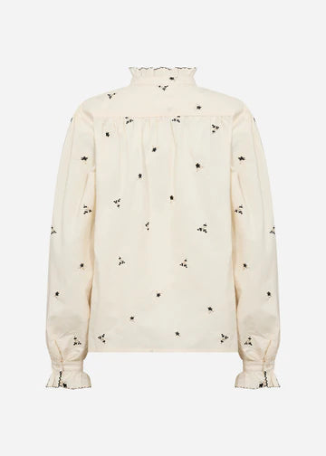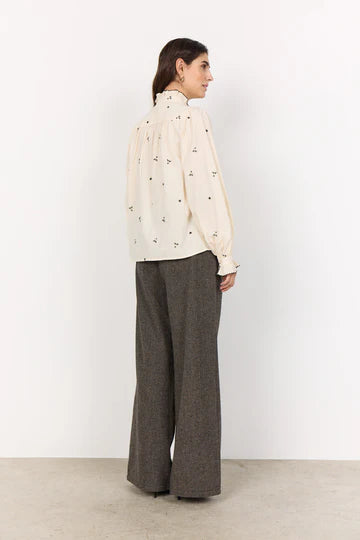 SC-VIBEN 1 Shirt is made from 100% organic cotton. It features a ruffled high collar, delicate front button closure, and floral embroidery. Pair it with tailored slacks or jeans for a casual yet stylish look.