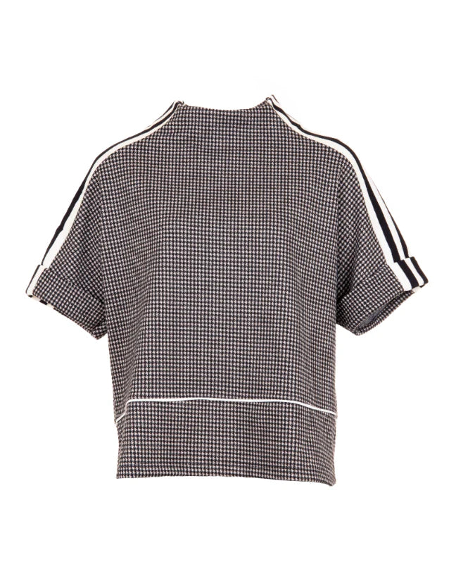 PERUZZI houndstooth top with high neckline and contrasting sleeve stripe detail.